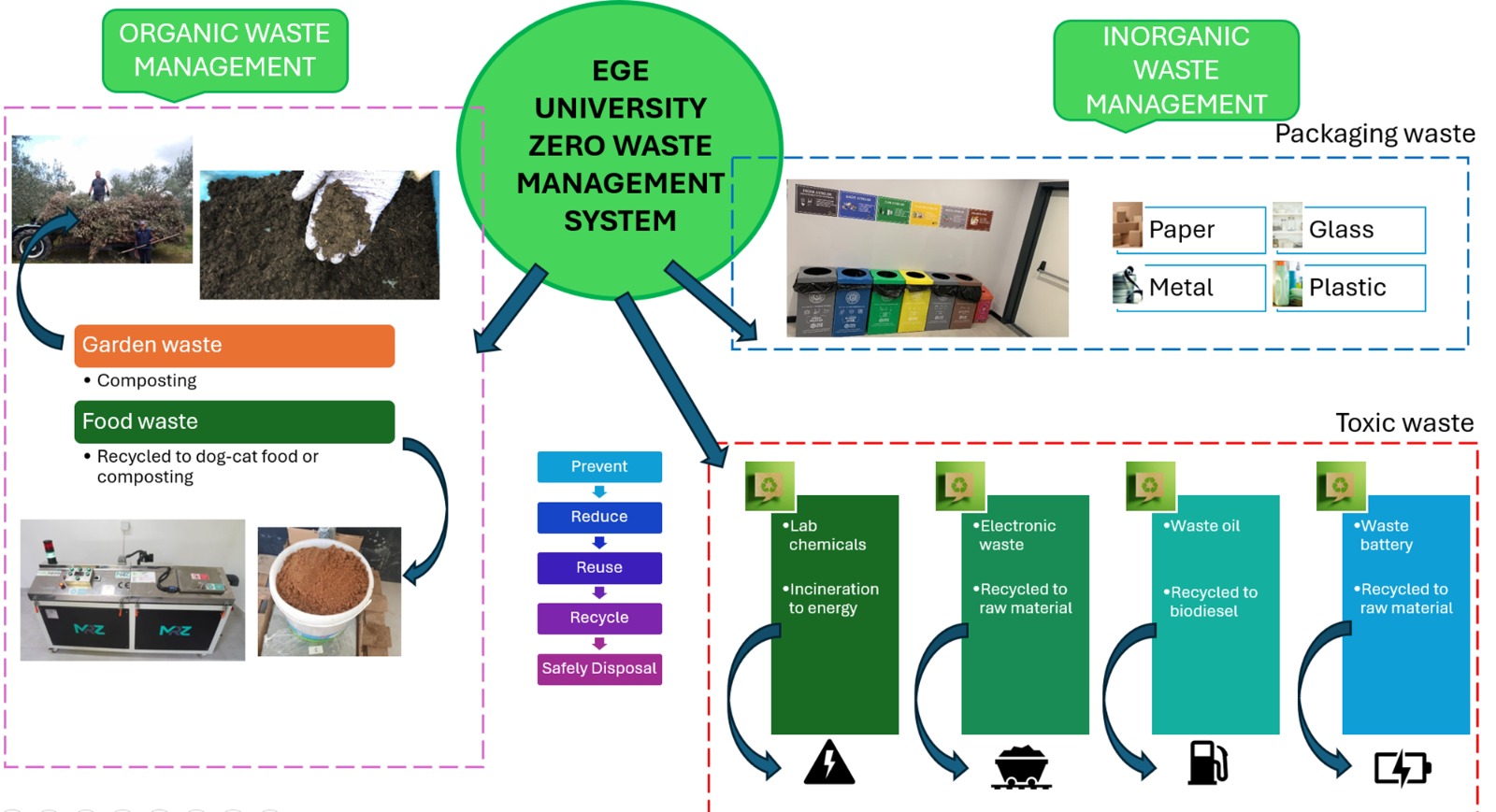 Ege University has established a comprehensive waste management and landfill avoidance policy to minimize the amount of waste sent to landfill. The policy aligns with Türkiye’s Zero Waste Regulation and the university’s institutional commitment to Sustainable Development Goal 12 (Responsible Consumption and Production). It emphasizes waste prevention, segregation at source, recycling, and valorization of organic and hazardous wastes before disposal.