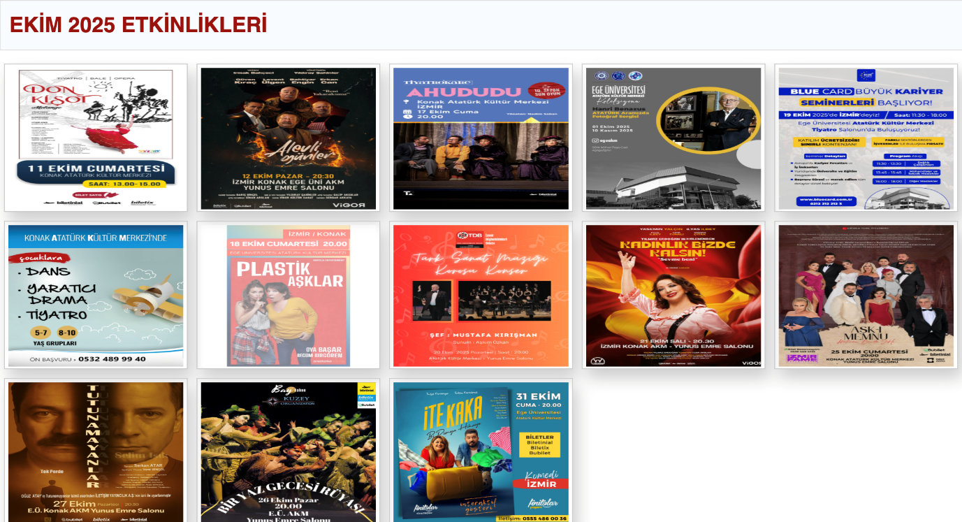Located in the city center of İzmir, the Ege University Atatürk Cultural Center hosts both free and paid educational, cultural, and artistic events. Among these activities are paid theater performances, dance and creative drama courses designed for children, as well as free seminars. The events are scheduled monthly and offered to the public.